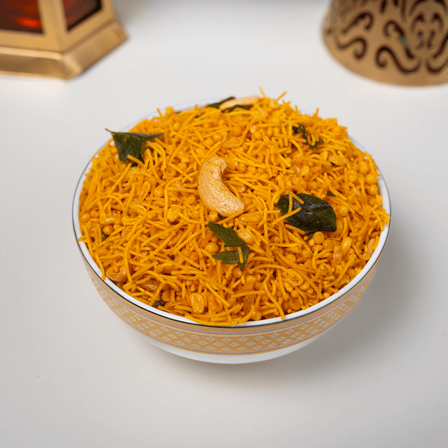 A bold and spicy snack inspired by Chettinad flavors, combining crunchy elements, roasted nuts, and aromatic spices, all fried in groundnut oil for a rich and fiery treat.