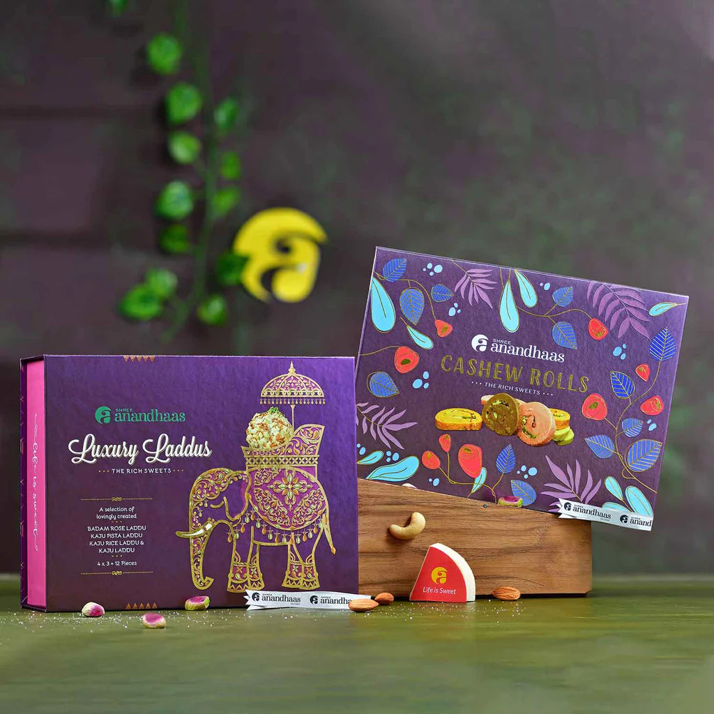Whether it's a festive occasion, a special celebration, or just a gesture of love, our assorted Luxury Laddy 12-piece & Cashew Roll Box are ideal gifts for those who enjoy rich, flavourful sweets and cashew!