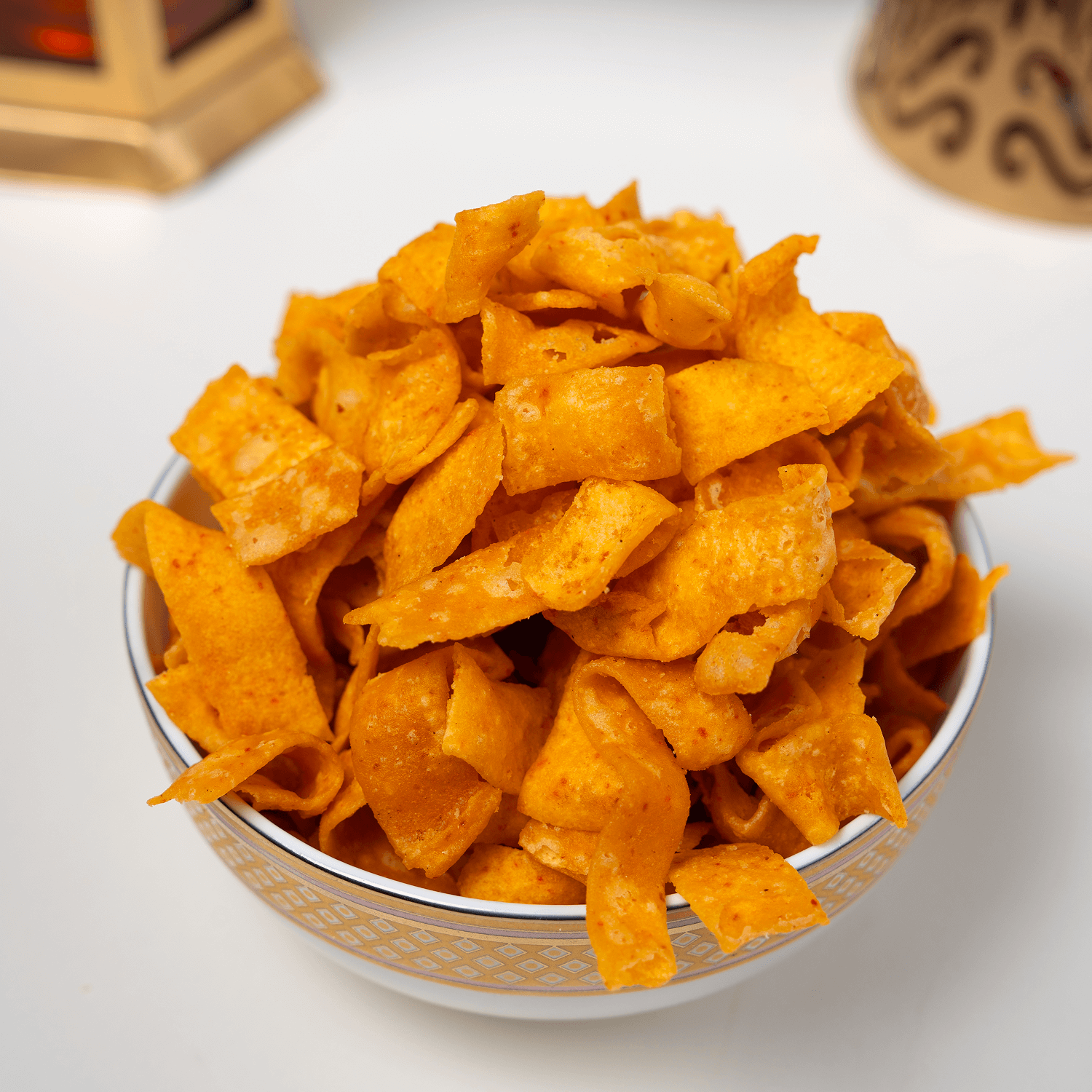 A traditional crunchy ribbon-like snack made from rice flour and mild spices, deep-fried in groundnut oil for a flavorful and satisfying bite.