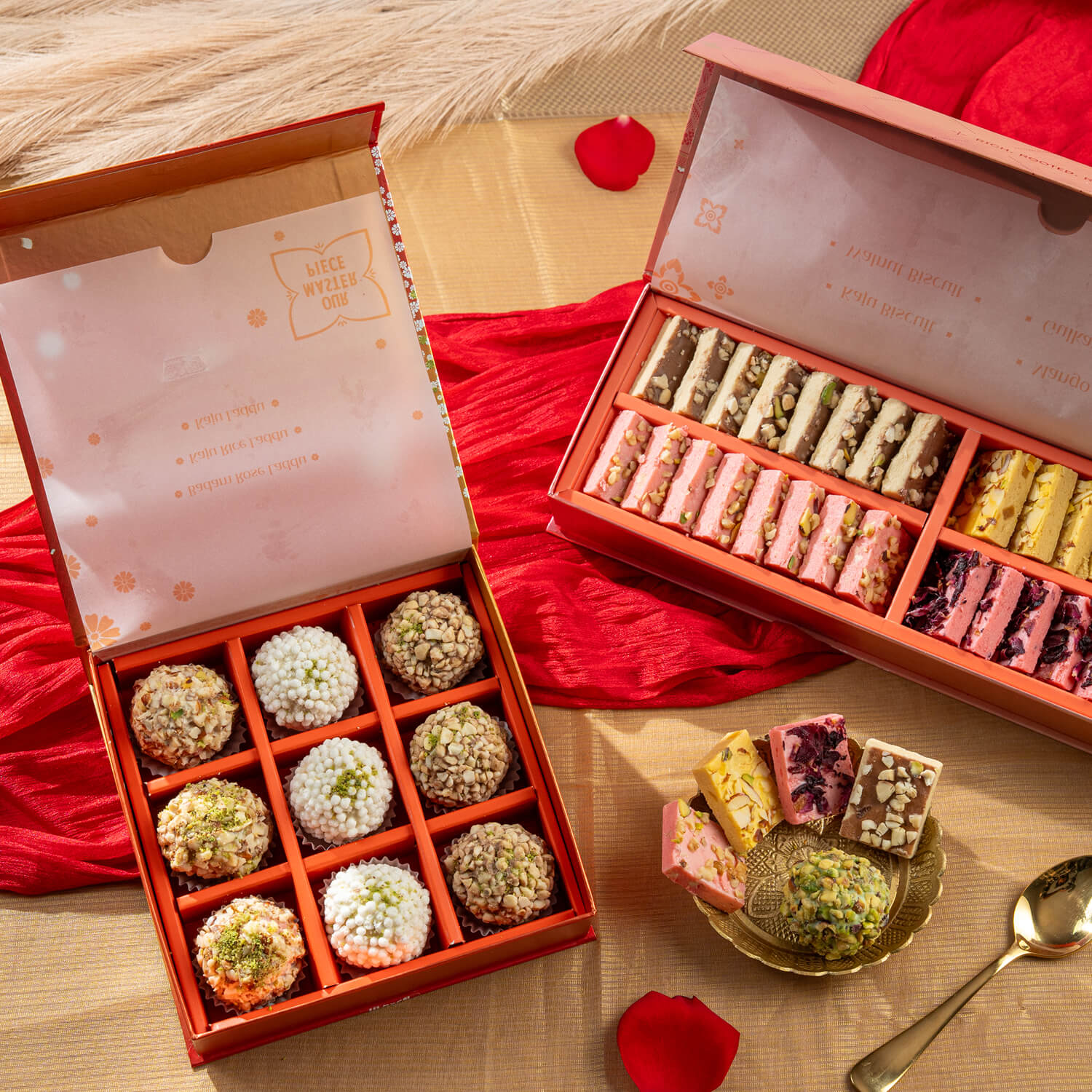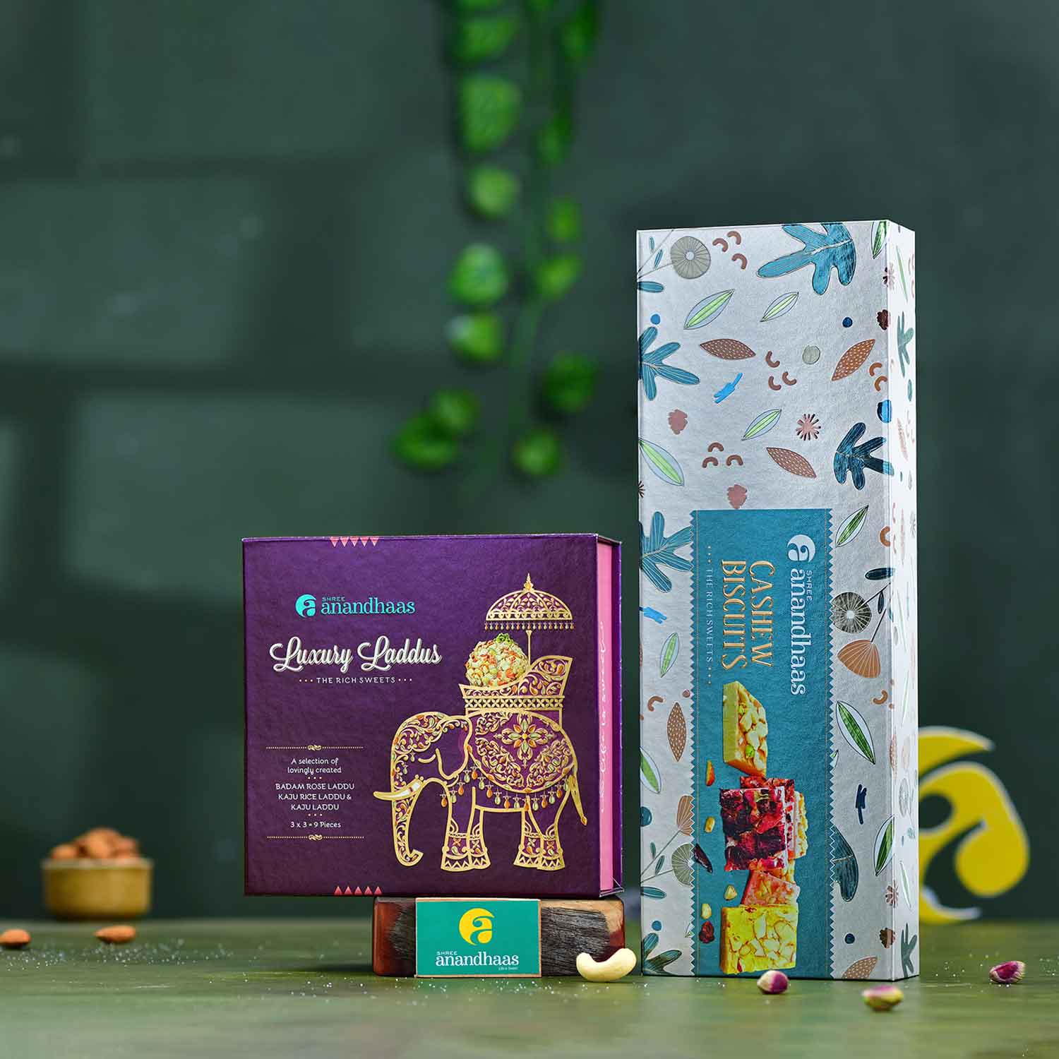 A selection of assorted Shree Anandhaas Sweets boxes like Luxury Laddu